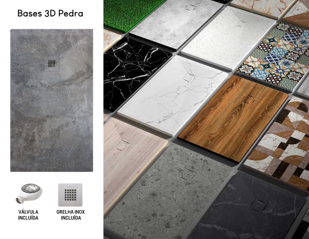 Bases disponíveis também em versão pedra 3D, com design exclusivo e diferenciador, estas bases apresentam uma superfície texturada que garante um estilo moderno e elegante.