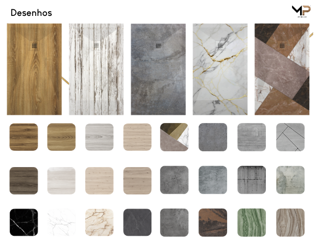 - Cores lisas ou com textura de madeira;