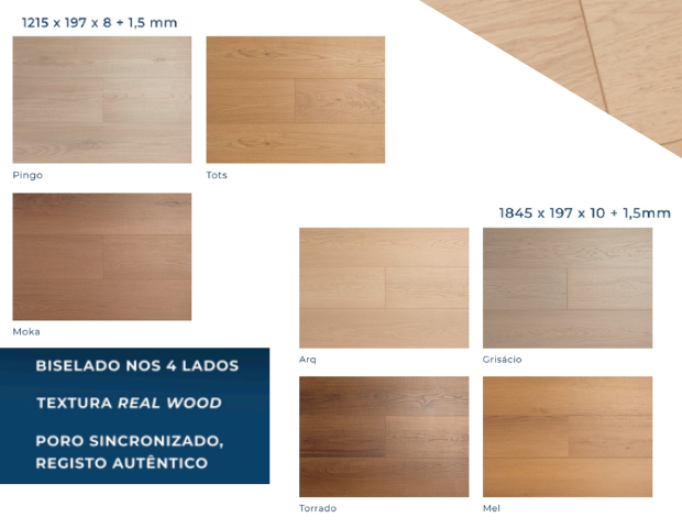 Acompanhando as tendências atuais de arquitetura e decoração neste tipo de revestimento consegue encontrar uma vasta gama de cores e acabamentos, desde cores naturais de madeira ou modelos com cores lisas.